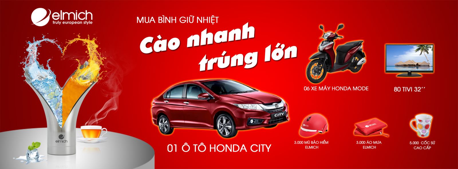Tin vui dành cho tất cả khách hàng yêu mến sản phẩm Elmich khi mua hàng tại tất cả các đại lý, showroom và siêu thị trên toàn quốc: chương trình khuyến mãi lớn nhất năm “Mua bình giữ nhiệt – Cào nhanh trúng lớn”. Khách hàng khi mua bất kì bình giữ nhiệt của thương hiệu Elmich sẽ nhận được thẻ cào và có cơ hội trúng 01 ô tô Honda City, 06 xe máy SH Mode, 80 Tivi 32’’ và hàng vạn giải thưởng hấp dẫn khác.