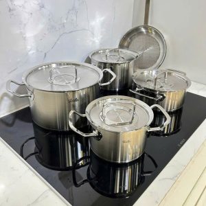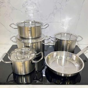 Sản xuất tại Đức: Bộ xoong nồi 5 món được làm từ thép không gỉ 18/10 cao cấp, được sản xuất tại Đức