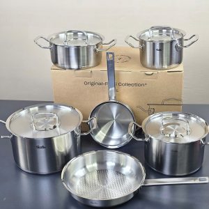 -Sản xuất tại Đức: Bộ xoong nồi 5 món được làm từ thép không gỉ 18/10 cao cấp, được sản xuất tại Đức