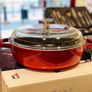 Chảo hầm từ STAUB có màu đỏ duyên dáng kết hợp giữa kỹ thuật thủ công truyền thống với chức năng hiện đại để mang đến sự thưởng thức độc đáo. nhiều món ăn có thể được chế biến trong chảo gang tiện dụng này. Vì nguyên liệu đặc biệt chỉ cần ít dầu mỡ để chiên và nắp kính giữ nước ngưng tụ bên trong chảo nên các món ăn ngon có thể được nấu với lượng calo thấp và gây ấn tượng với hương vị và chất dinh dưỡng đầy đủ. Lớp men đen mờ làm tăng hương vị của các món ăn, trong khi gang đảm bảo phân phối nhiệt tối ưu.
