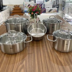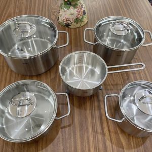 Với những đường nét sắc sảo và tính ứng dụng cao, bộ nồi inox cao cấp Fissler Viseo 5 món lí tưởng dành cho các chuyên gia hay các bạn nội trợ muốn chuẩn bị những món ăn khác nhau cho gia đình. Kết hợp nhiều chức năng thiết thực như đáy nồi Superthermic truyền dẫn nhiệt nhanh và đều, tiết kiệm thời gian, thân nồi thép không gỉ 18/10 cao cấp an toàn cho sức khỏe, giữ món ăn nóng lâu hơn khi chưa dùng ngay. Nắp nồi làm bằng thủy tinh giúp dễ dàng quan sát quá trình nấu nướng và có khả năng chịu lên đến 180OC. Đáy nồi thích hợp sử dụng cho tất cả loại bếp kể cả bếp từ.