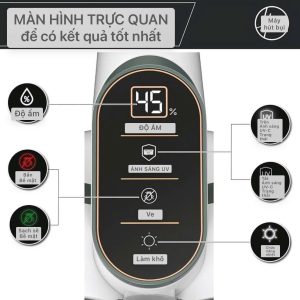 – Hiển thị trực quan: Màn hình LED trực quan và hiển thị: mức độ ẩm được phát hiện, trạng thái của đèn UV, cảm biến bụi và chức năng sấy khô.