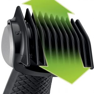Gắn phụ kiện lược vào hệ thống cạo để cắt tóc có độ dài bằng nhau là 3 mm. Để cạo râu mượt mà hơn, bạn cũng có thể sử dụng hệ thống cạo mà không cần lược đi kèm. Đối với tóc dày hơn, nên sử dụng phụ kiện lược để tỉa tóc.