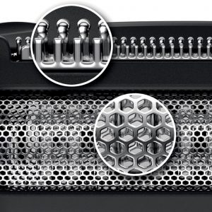 Đầu cạo có các đầu tròn đã được cấp bằng sáng chế và một lá cạo không gây dị ứng để bảo vệ da khi cạo. Tông đơ cắt tóc dài hai chiều cắt tóc dài hơn được lấy ra khỏi giấy bạc để có kết quả triệt để hơn.