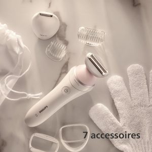 * Bộ sản phẩm bao gồm 1 x Philips Lady Shaver Series 6000, 6 x phụ kiện bao gồm 1 x Găng tay tẩy tế bào chết toàn thân, 1 x Lược và phụ kiện vùng bikini và 1 x Bàn chải làm sạch.