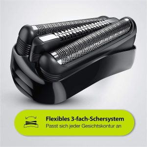 3 phần tử dao cạo di chuyển độc lập (hệ thống cạo ba lần linh hoạt) thích ứng với mọi đường nét trên khuôn mặt – để tiếp xúc với da tối đa. Đã thử nghiệm trên râu 3 ngày.