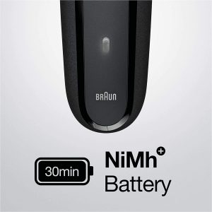 -Máy có thể hoạt động liên tục 30 phút trong một lần sạc đầy pin, thời gian sạc đầy pin là 1h, công nghệ sạc nhanh trong 5 phút là đủ cho một lần cạo râu