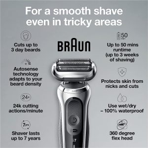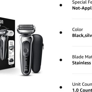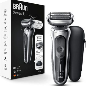 Máy cạo râu điện Braun Series 7 dành cho nam giới có khả năng thích ứng 360 độ để cạo râu êm ái. Có công nghệ autosense đọc và điều chỉnh mật độ râu của bạn, loại bỏ nhiều sợi lông hơn trong mỗi lần vuốt. Pin Li-ion cho phép cạo râu lên đến 3 tuần và sạc nhanh trong 5 phút. Máy cạo râu điện dành cho nam này có khả năng chống thấm nước 100% khi sử dụng ướt và khô. Tương thích với hệ thống nhấp chuột dễ dàng. Bao gồm phụ kiện tông đơ chính xác.