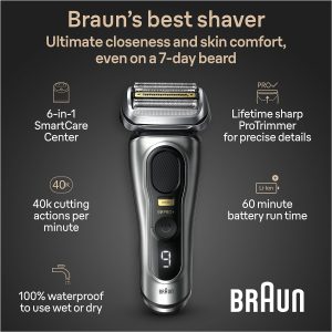 DÙ CẠO RÂU 1, 3 HAY 7 NGÀY: Máy cạo râu điện Series 9 PRO+ dành cho nam giới có 5 bộ phận cạo râu được đồng bộ hóa hoàn hảo mang lại hiệu quả và sự thoải mái cho làn da vượt trội, ngay cả trên những sợi lông dài nhất và khó cạo nhất trong mỗi lần cạo