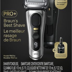 BAO GỒM: Máy cạo râu điện Braun Series 9 PRO+ 9567cc dành cho nam giới với Precision ProTrimmer tích hợp, Trung tâm SmartCare 6 trong 1, Đế sạc, Hộp đựng dao cạo vải du lịch và Chổi vệ sinh