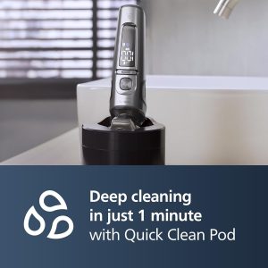 Nội dung đóng gói: 1 máy cạo râu, 1 Máy tỉa lông chính xác Click-on, 1 Trạm làm sạch nhanh & 1 Hộp đựng du lịch sang trọng.