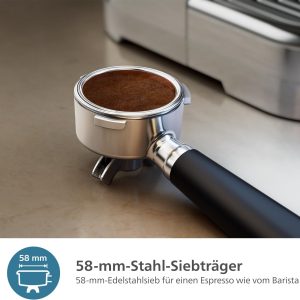 -PHA CÀ PHÊ NHƯ MỘT BARISTA: Với máy pha cà phê espresso Philips Barista, những người đam mê cà phê có thể pha chế cà phê chất lượng barista bằng các dụng cụ như rây lọc 58 mm và giỏ lọc một lớp và hai lớp.