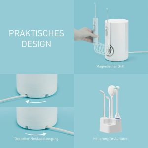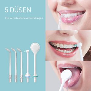 Nhiều đầu phun: máy tăm nước có 3 đầu phun siêu âm, một đầu phun chỉnh nha để làm sạch các dụng cụ như niềng răng và cầu răng, và một đầu phun làm sạch lưỡi để nhẹ nhàng rửa sạch bề mặt.