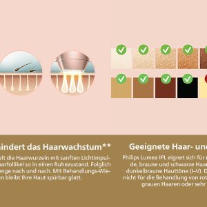 – Philips Lumea Prestige hoạt động hiệu quả trên các màu tóc như vàng sẫm, nâu và đen cũng như các tông màu da từ trắng đến nâu đậm