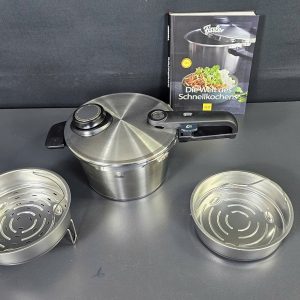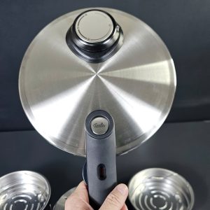 – An toàn: nhờ chức năng hơi nước trên núm nấu và tay cầm, áp suất có thể dễ dàng giảm xuống theo yêu cầu. Nhờ hỗ trợ đính kèm thực tế và chỉ báo khóa, nhảy từ màu đỏ sang màu xanh lá cây và khóa tại chỗ bằng một tiếng “click”, việc đóng an toàn được đảm bảo.