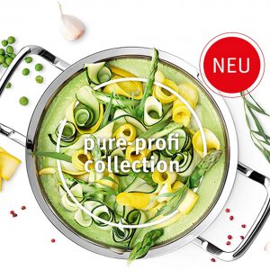 - Thông minh: thang đo tích hợp của nồi nấu cho phép định lượng thực tế mà không cần cốc đo. Dụng cụ nấu ăn từ bộ sưu tập chuyên nghiệp ban đầu có thể dùng an toàn với lò nướng ở nhiệt độ lên tới 230 °C (450 °F) và cũng an toàn với máy rửa chén