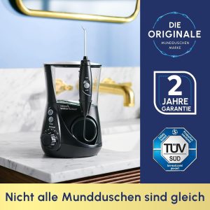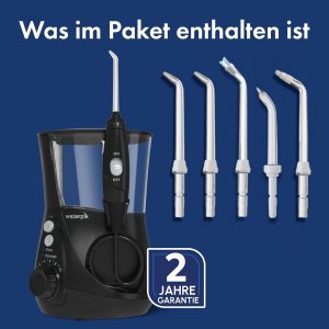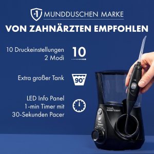 Máy tăm nước điện chuyên nghiệp có công tắc bật/tắt nước trên tay cầm, đèn LED báo hiệu và sáu đầu phun. Công nghệ điều biến xung mới giúp loại bỏ mảng bám tối đa (chế độ làm sạch) và kích thích nướu tốt hơn (chế độ massage xung nước).