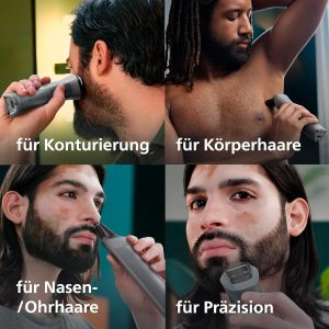 – 12 phụ kiện đính kèm đáp ứng mọi nhu cầu của bạn: tỉa râu, tẩy lông trên cơ thể, tông đơ cắt tóc, tỉa mũi/tai/lông mày. 14 cài đặt độ dài (0,5-16 mm) cho mọi kiểu râu.